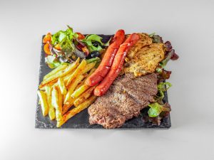 Jugosa Carne nacional, pechuga de pollo y salchichas a la parrilla con patatas, ensalada y una salsa a elegir.