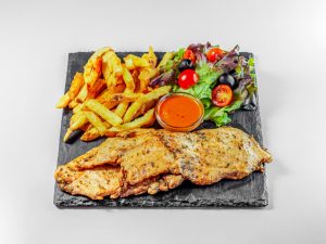 Enjoy our juicy grilled chicken breast accompanied by potatoes and salad plus a delicious sauce of your choice.